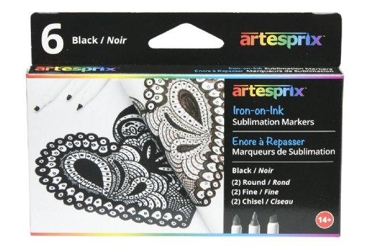 Black Sublimation Markers, box of six black markers, which includes two round nibs, two fine nibs, and two chisel nibs.