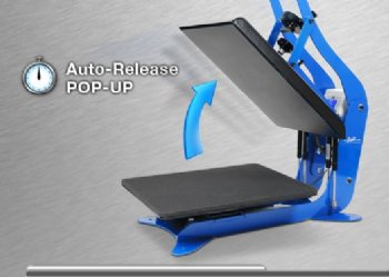 The Auto-Release upgrade also features the "HOVER" feature. This means when the handle is lowered without fully clamping the machine, the press will hover over the work, usually needed for curing purposes. At the end of the time cycle the press releases automatically as usual.