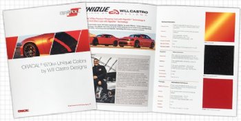 8.5"" x 11"" half fold flyer with 3"" x 3"" samples of ORACAL 970RA UNIQUE Colors by Will Castro Designs. Colors: 100 sunset shift, 905 black galactic gold, 372M matte imperial red pearl