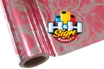 The image shows a close-up view of a textile foil with a pattern of roses. The foil features a shiny, metallic surface with roses in shades of pink. The roses are arranged in a repeating pattern, creating a romantic and elegant effect.
